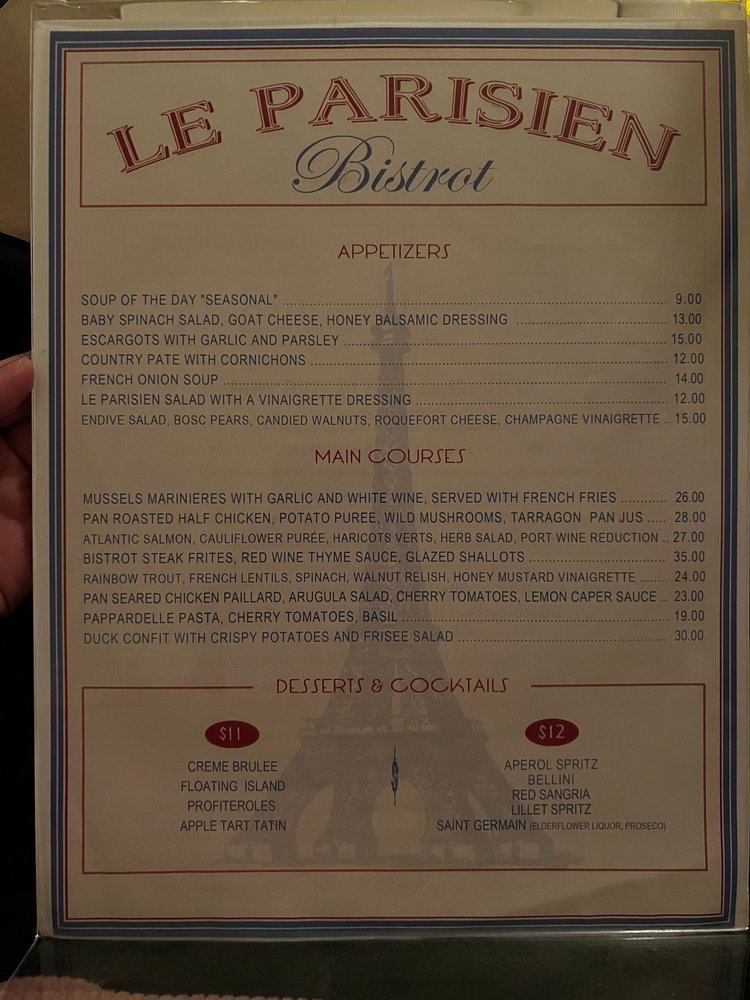 The menu is a symphony of flavors featuring standout dishes like the Bistrot Steak Frites, served with red wine thyme sauce, and the Escargots, swimming in garlic and parsley. For sweet endings, indulge in their Apple Tarte Tatin or Creme Brulee, both exquisite at just $12. With wines that beautifully complement the dishes and a welcoming staff, your experience here is bound to be memorable.
